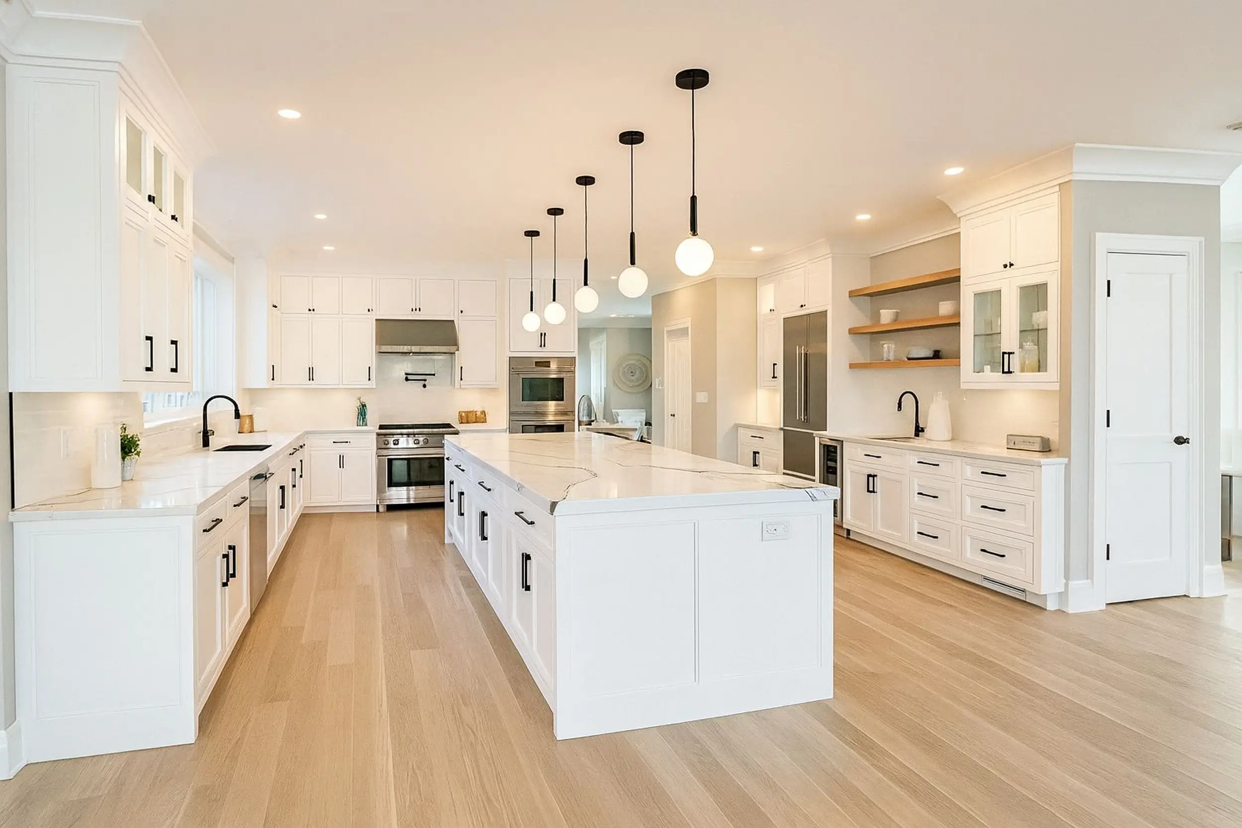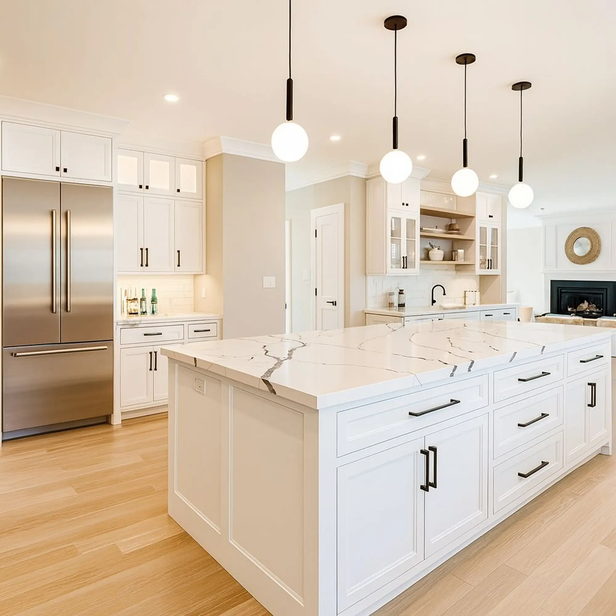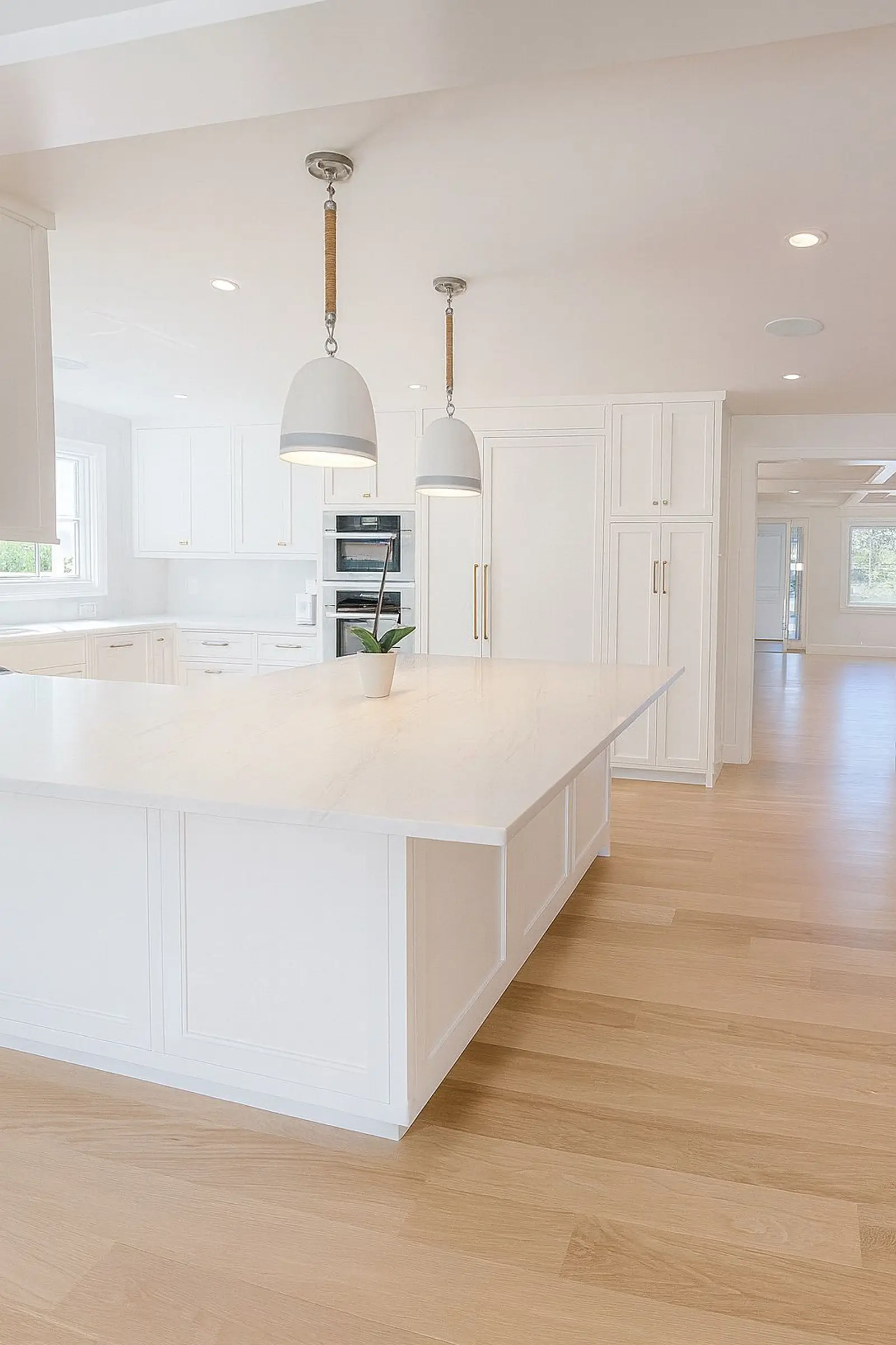 Organic warmth, natural light, balanceThis kitchen embraces sunlight and nature with warm light-wood tones and crisp white finishes. The spacious island and pendant lights create a welcoming, social space for cooking, gathering, or working. A perfect blend of contemporary design and organic comfort.