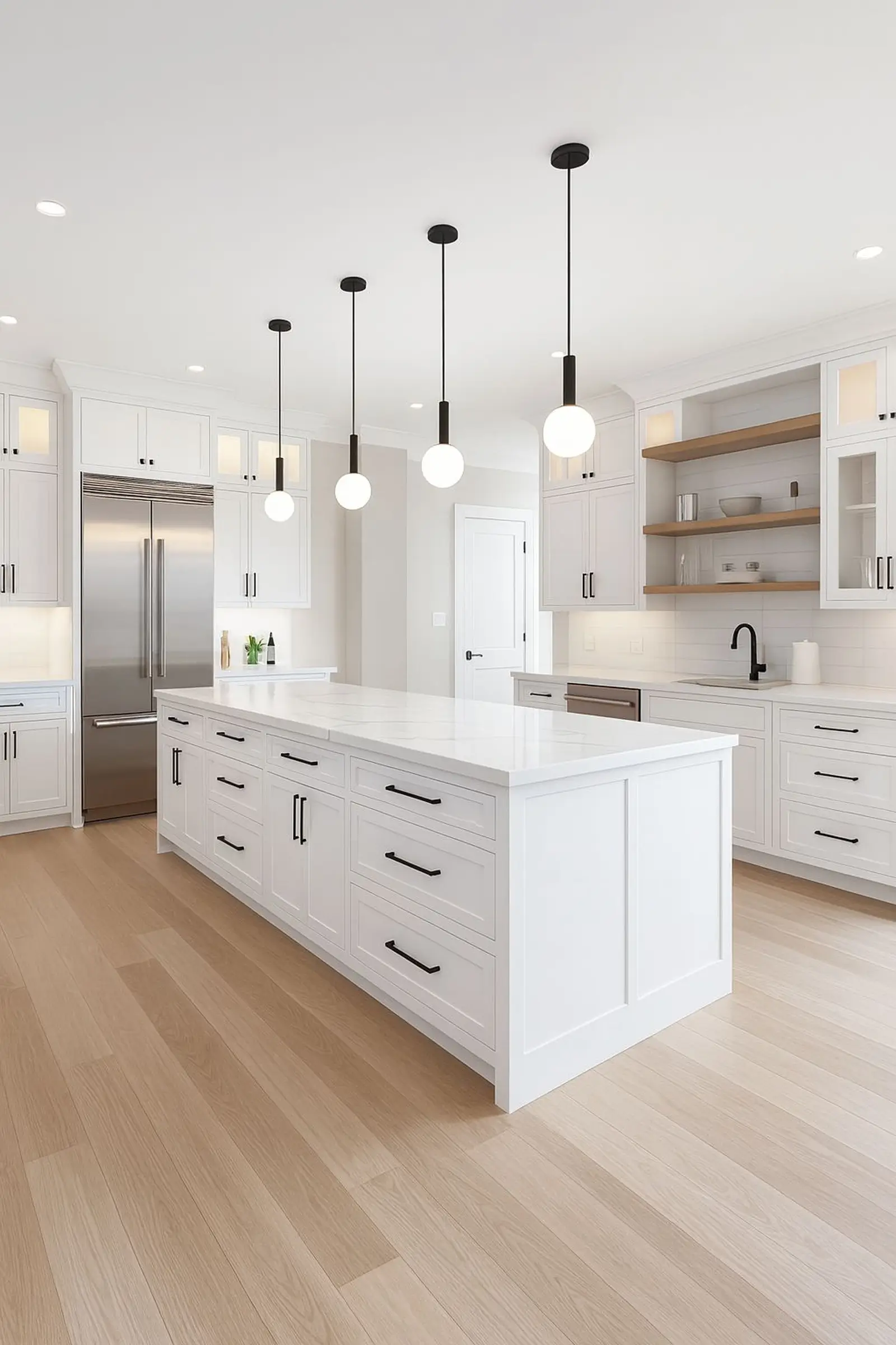 Light, calm, purityThis kitchen features clean lines and a soft minimalist aesthetic, blending white shaker cabinets with subtle countertops and seamless lighting. Bright and airy, it evokes a sense of order, peace, and timeless elegance. Perfect for those who appreciate a fresh, serene, and sophisticated atmosphere.