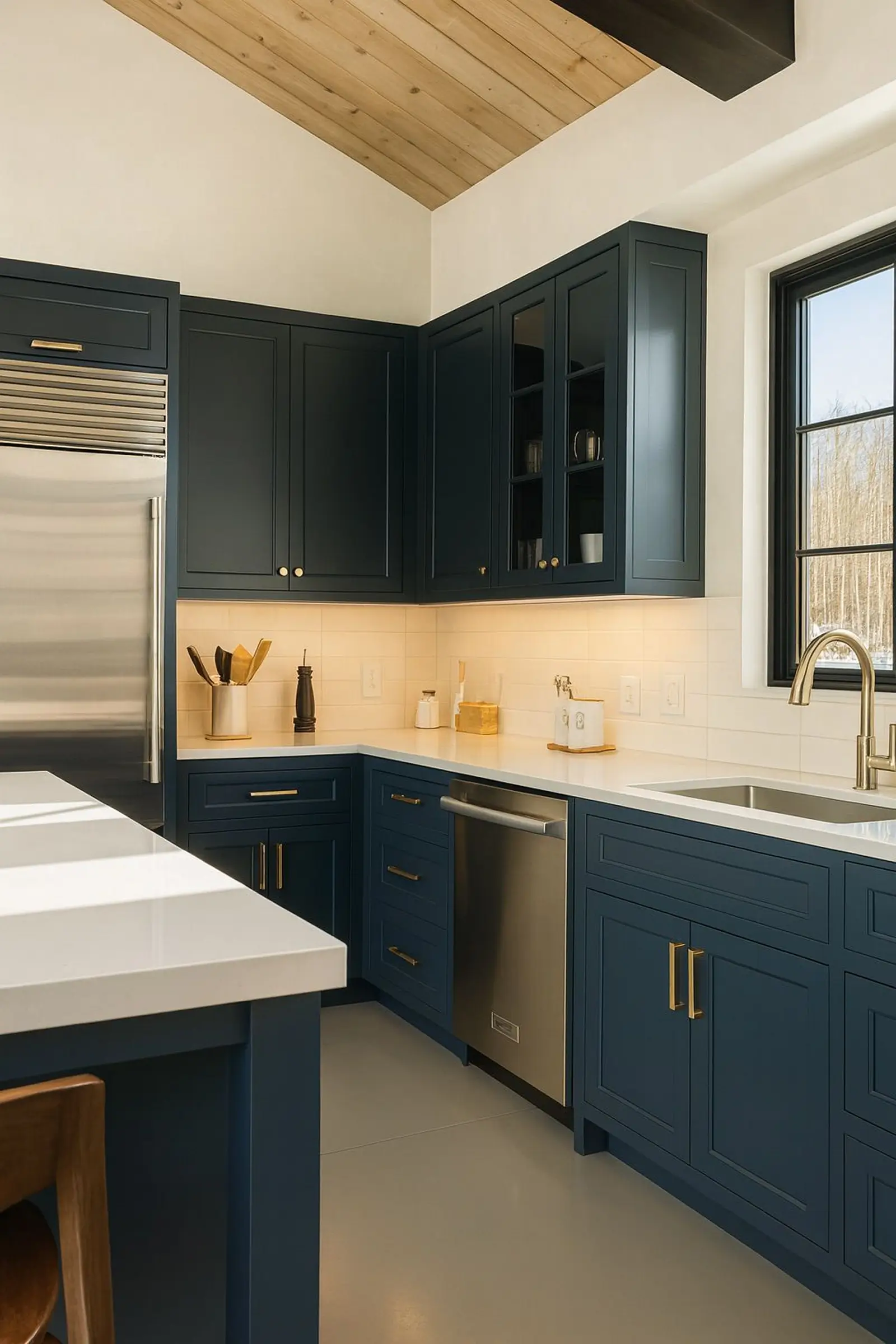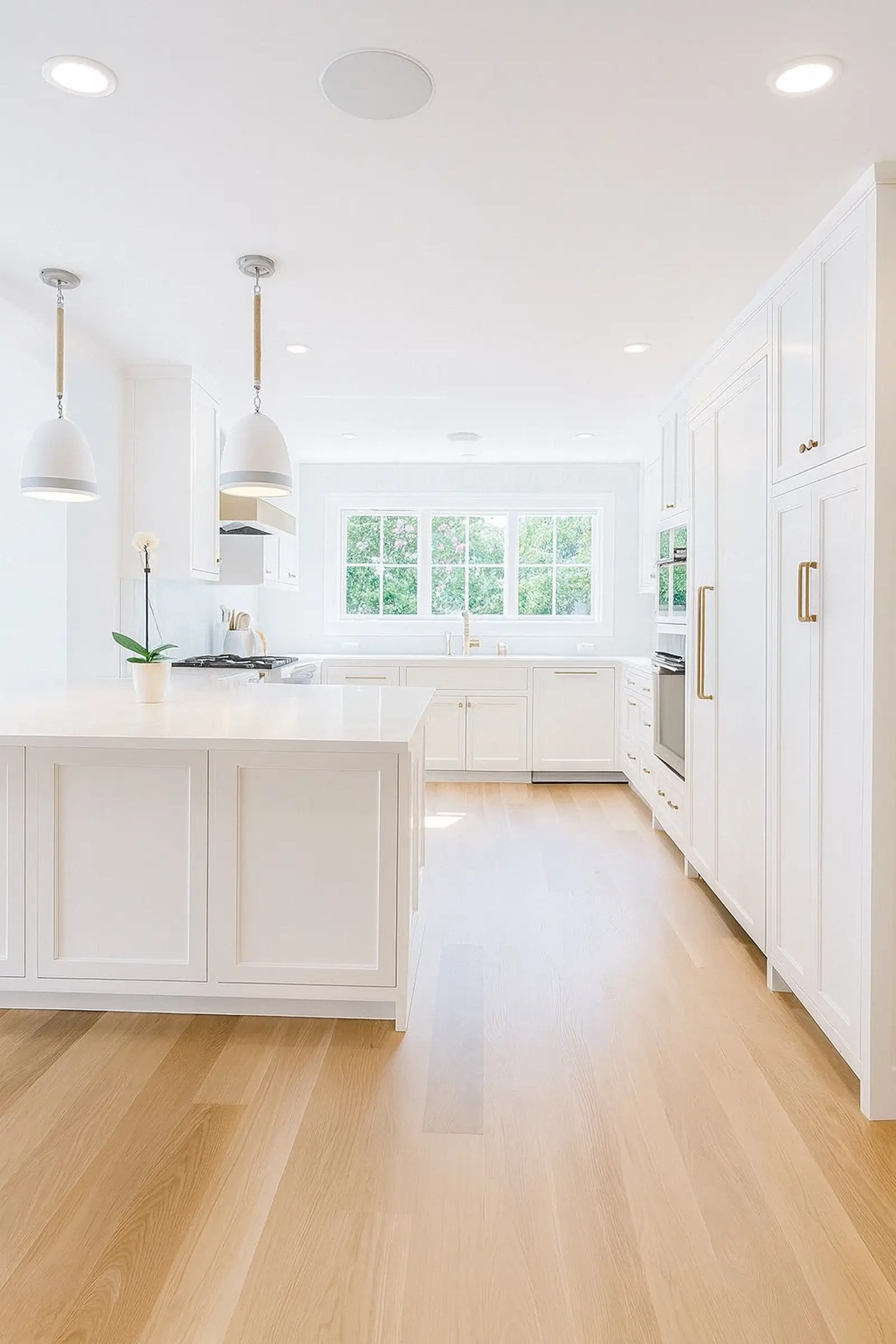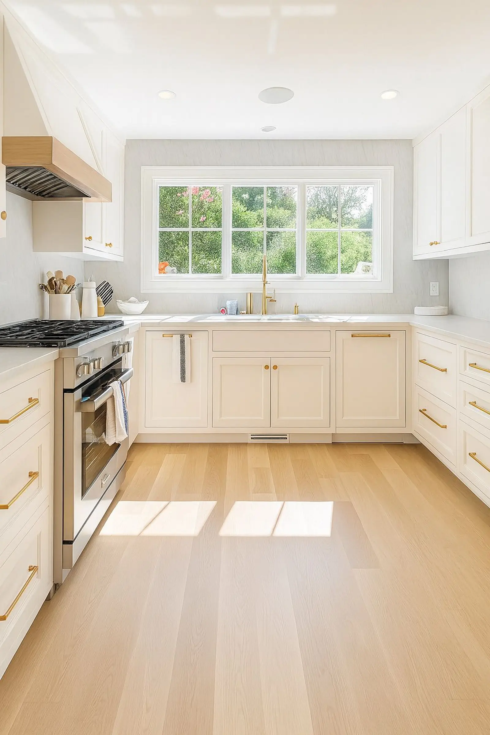 Daylight, elegance, outdoor connectionFramed by a large window overlooking lush greenery, this kitchen is flooded with natural light. Brass accents add character and warmth, while light wood flooring enhances openness and charm. A bright, stylish, and inviting space designed for joyful cooking and beautiful living.