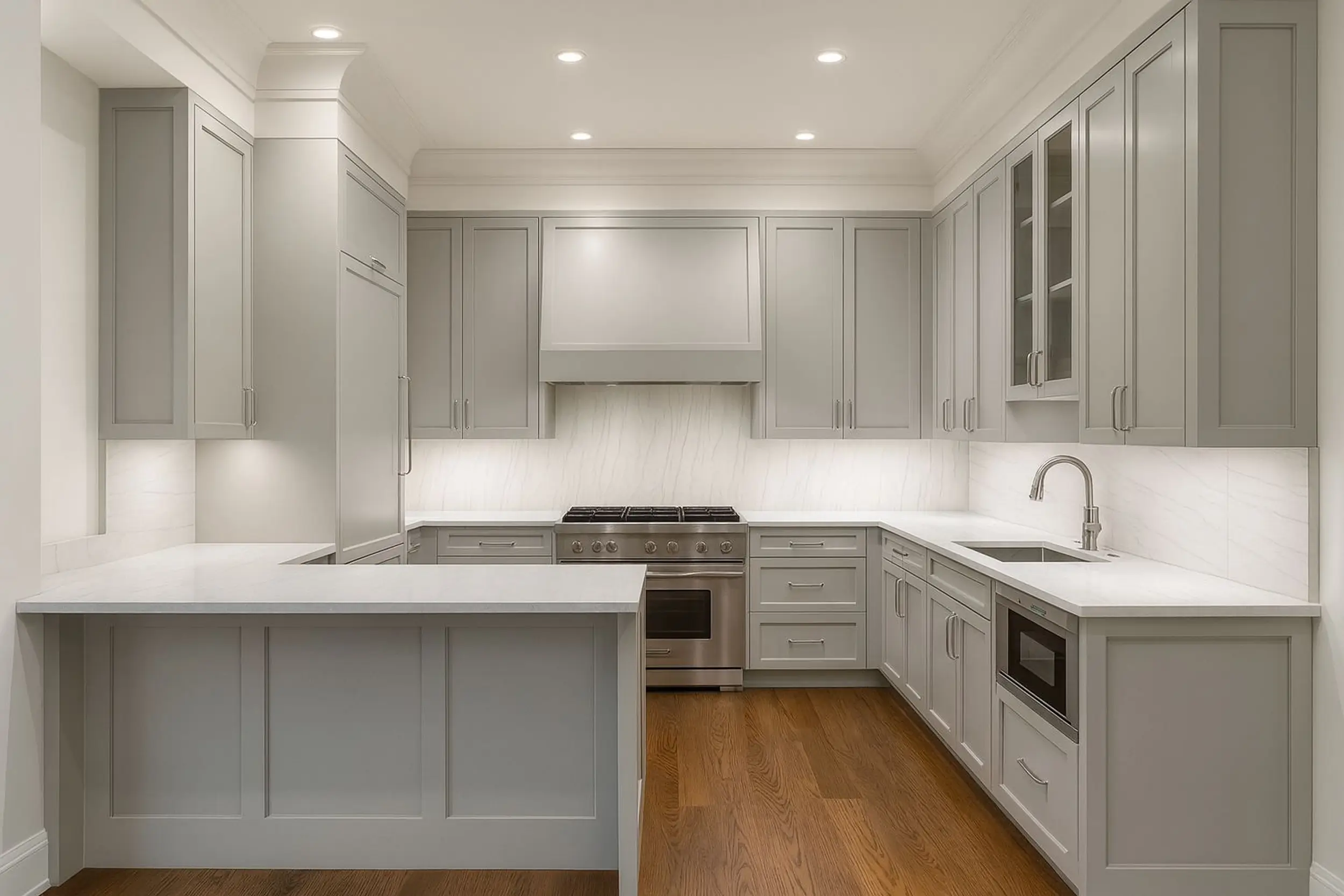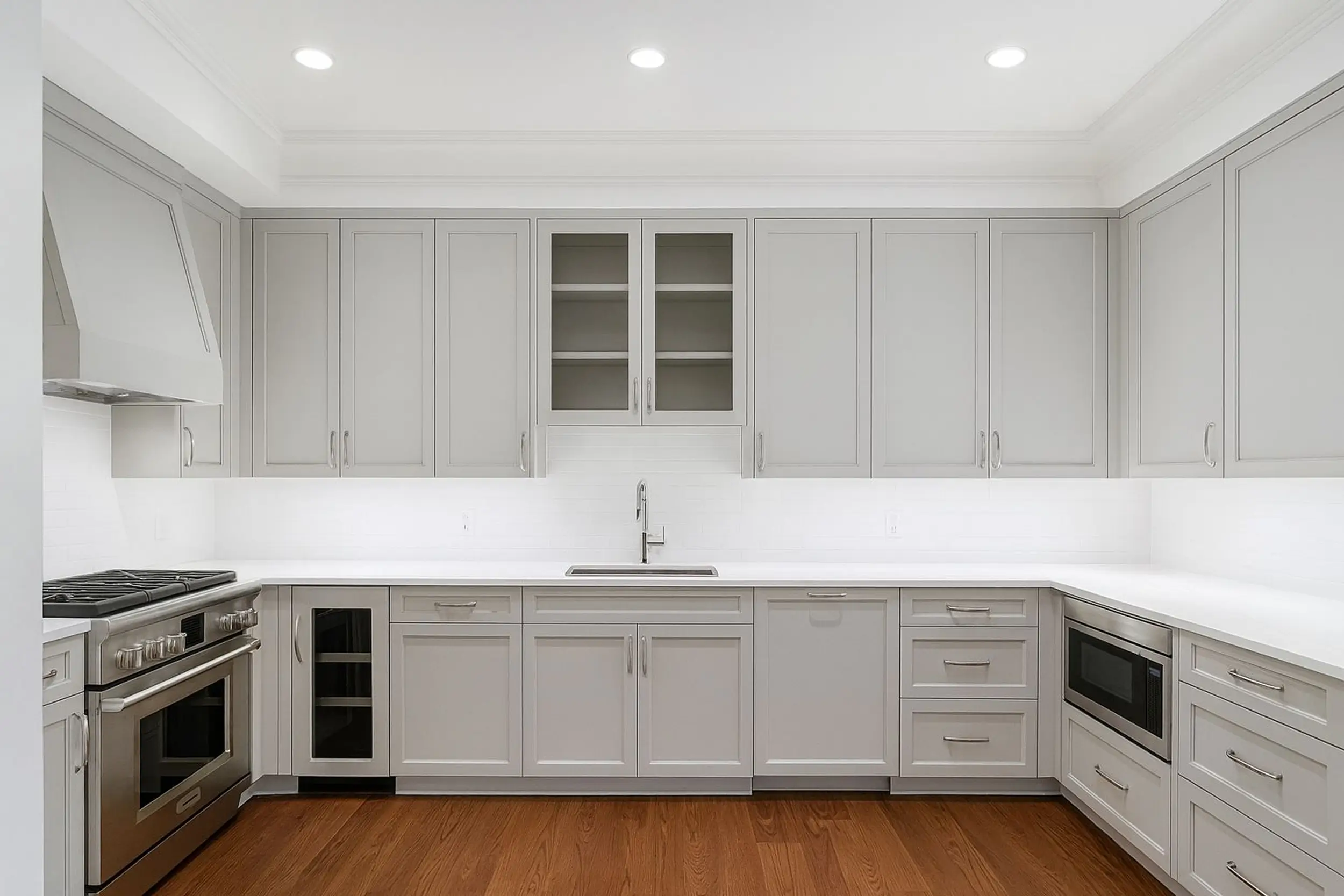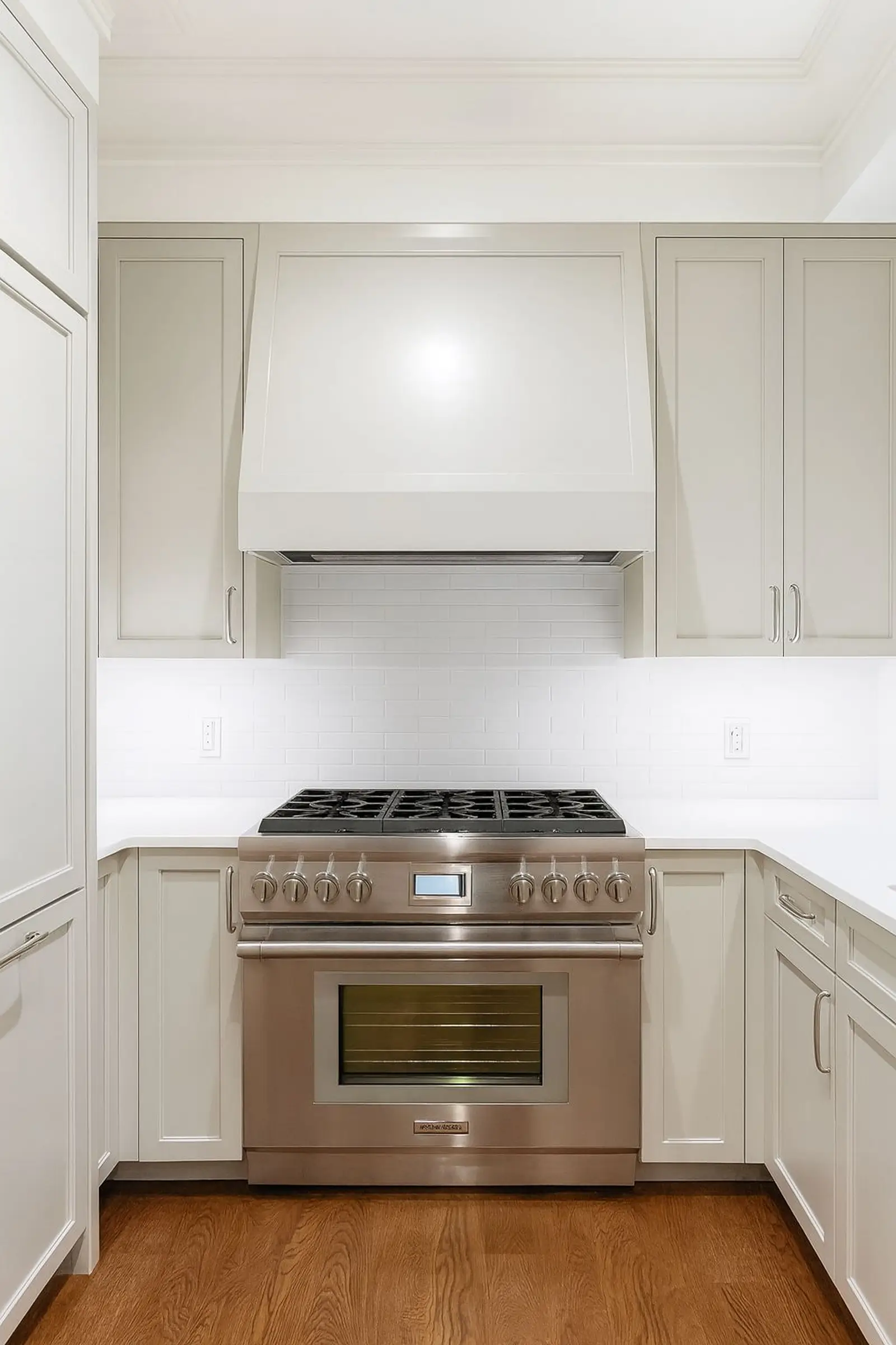 Warm gray, quiet luxury, modern eleganceSoft gray cabinetry, satin white surfaces, and flawless detailing define this elegant kitchen. Designed for both beauty and function, it pairs subtle sophistication with warmth, thanks to its natural wood flooring and professional-grade appliances. Ideal for those who appreciate refined, understated style.