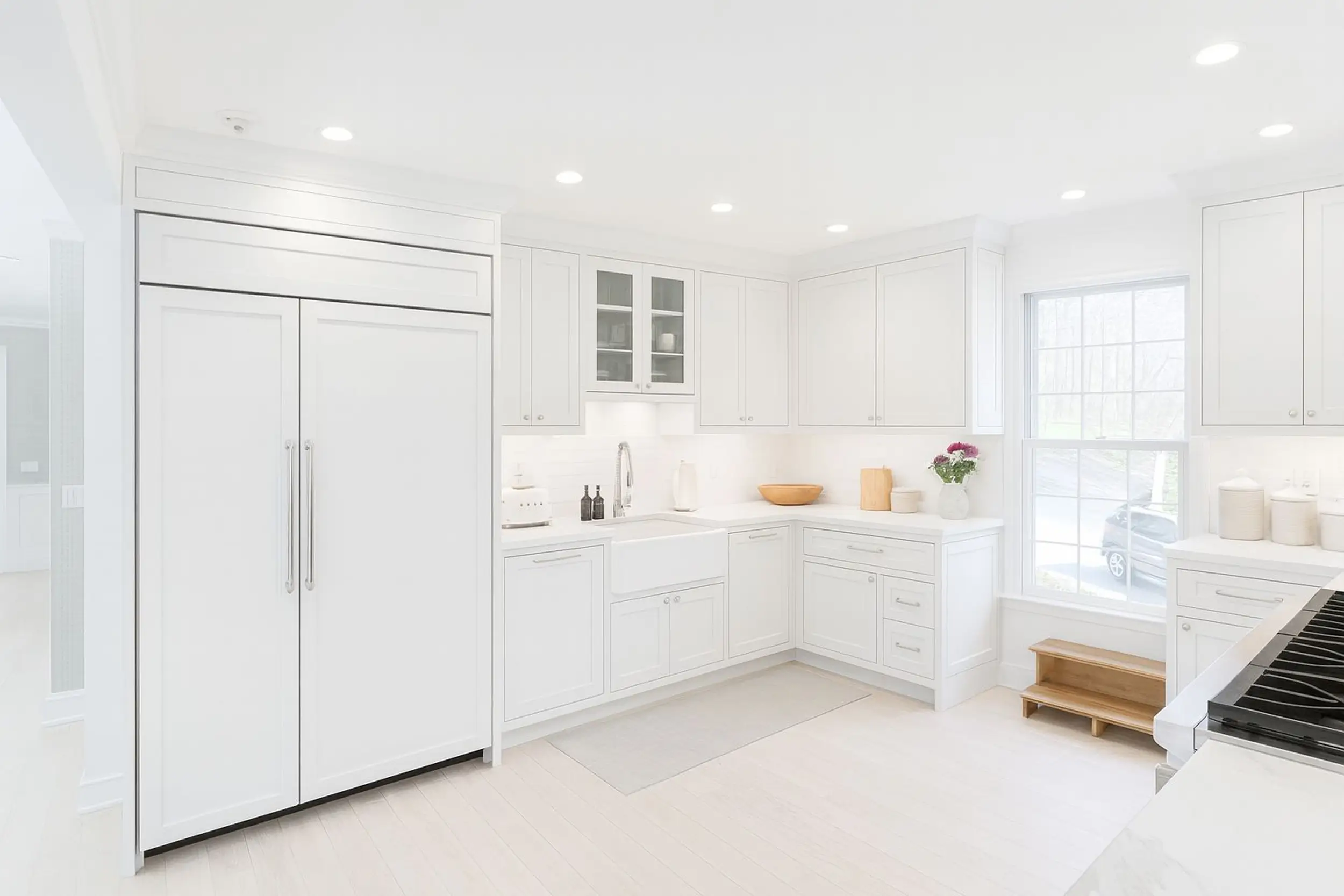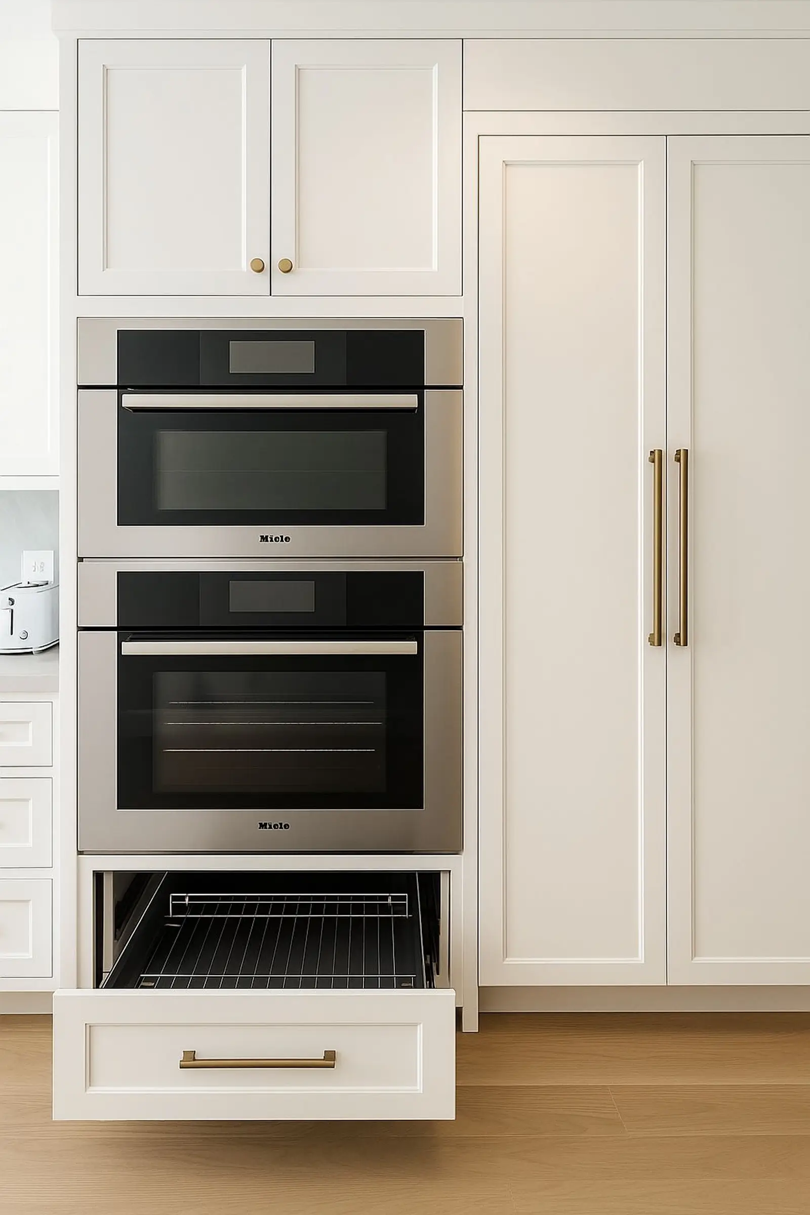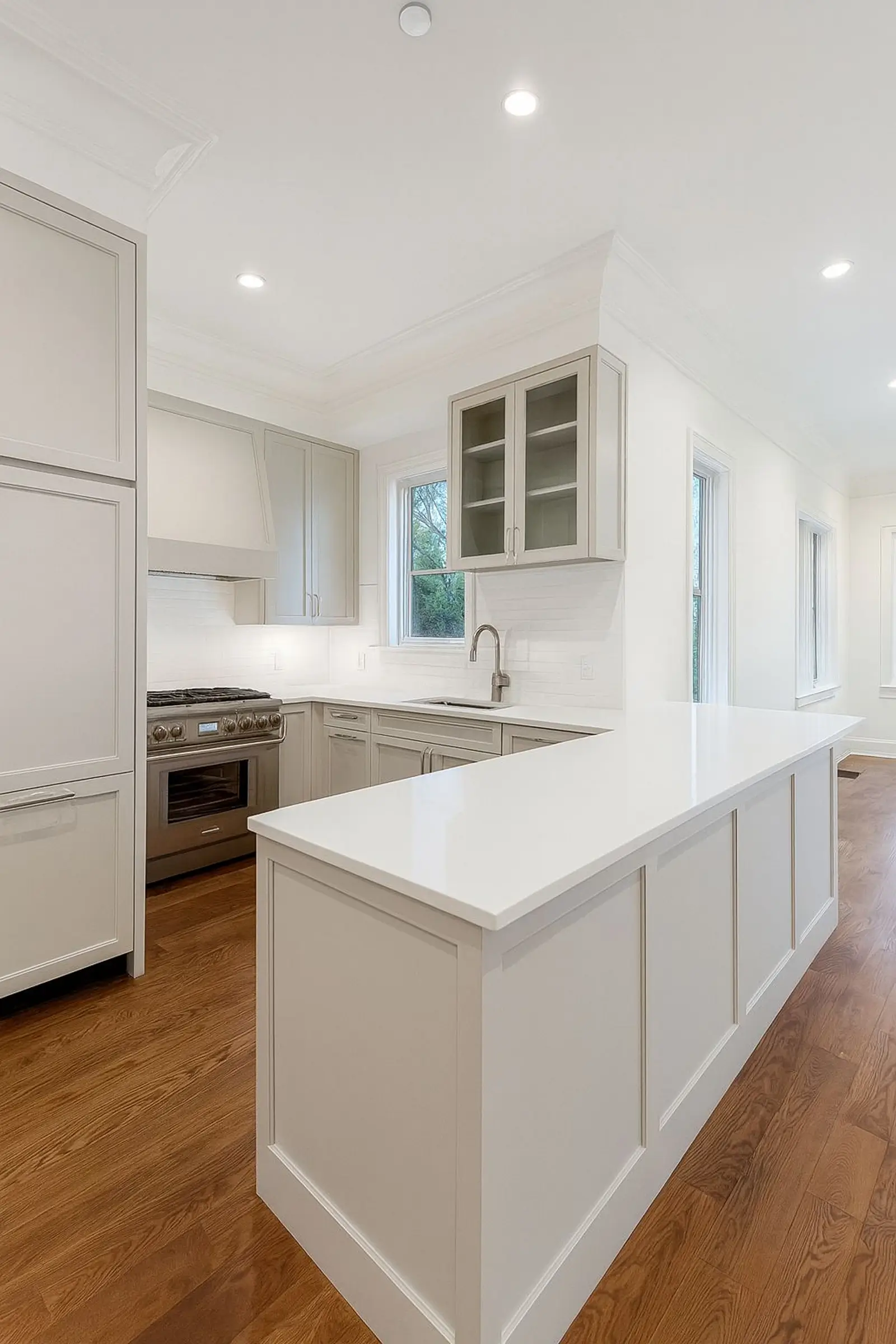 Warm gray, quiet luxury, modern eleganceSoft gray cabinetry, satin white surfaces, and flawless detailing define this elegant kitchen. Designed for both beauty and function, it pairs subtle sophistication with warmth, thanks to its natural wood flooring and professional-grade appliances. Ideal for those who appreciate refined, understated style.