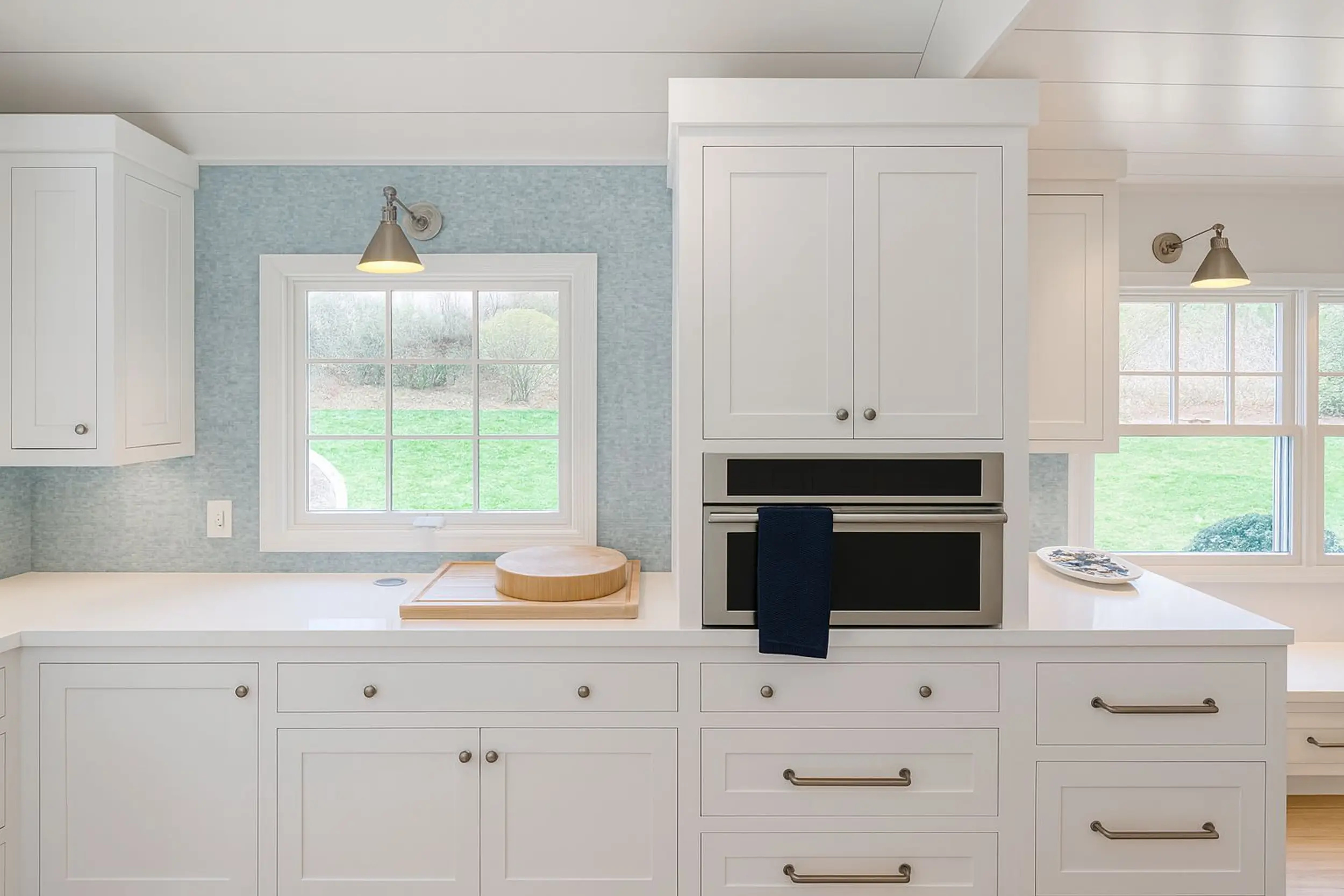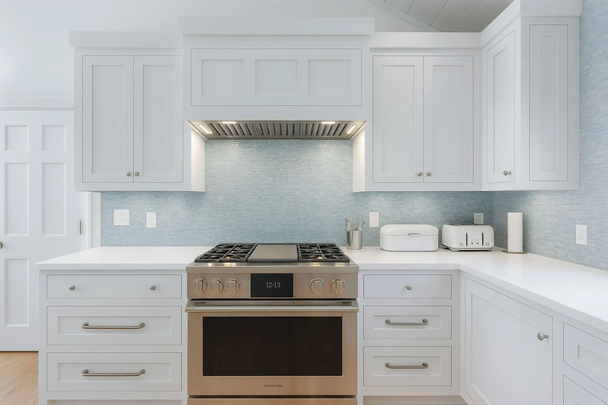Soft color, balance, modern simplicityA delicate blue mosaic backsplash adds character while maintaining harmony and simplicity. White cabinetry and integrated appliances create a balanced and modern environment, inspired by refined Nordic design. A space that feels calm, stylish, and effortlessly elegant.